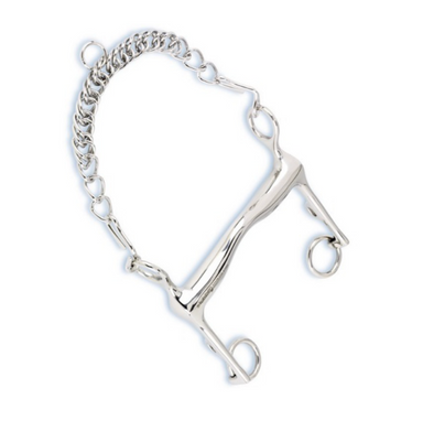 Chrome plated with fleece lined leather nosepiece and curb chain. This is a Blair's Pattern mechanical hackamore that operates on a leverage system...