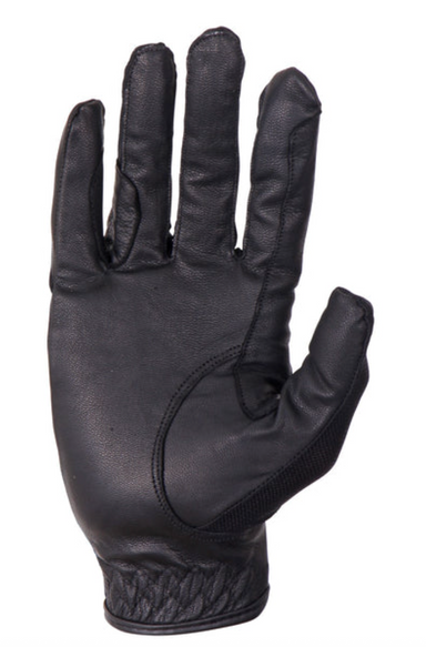 Polyester spandex back with supple tackified chrome leather palm to ensure good grip, even in the wet. Popular choice for eventers.